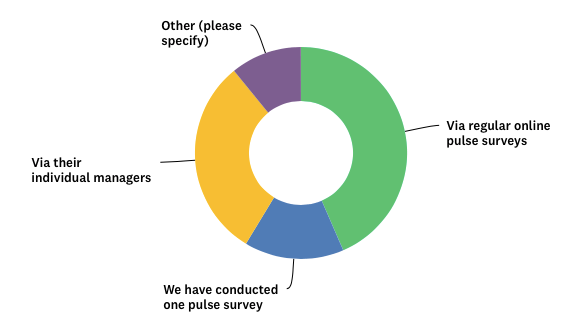 If employers appear robustly keen on communicating outwards to their people, we then analysed how they were going about listening to their employees and their concerns. Perhaps the answers to this particular question feel less convincing, less accountable. If some 43% of respondents were running regular pulse surveys, others seemed to be doing far less. The comments section suggested that a small number of organisations had not run any listening exercises at all.